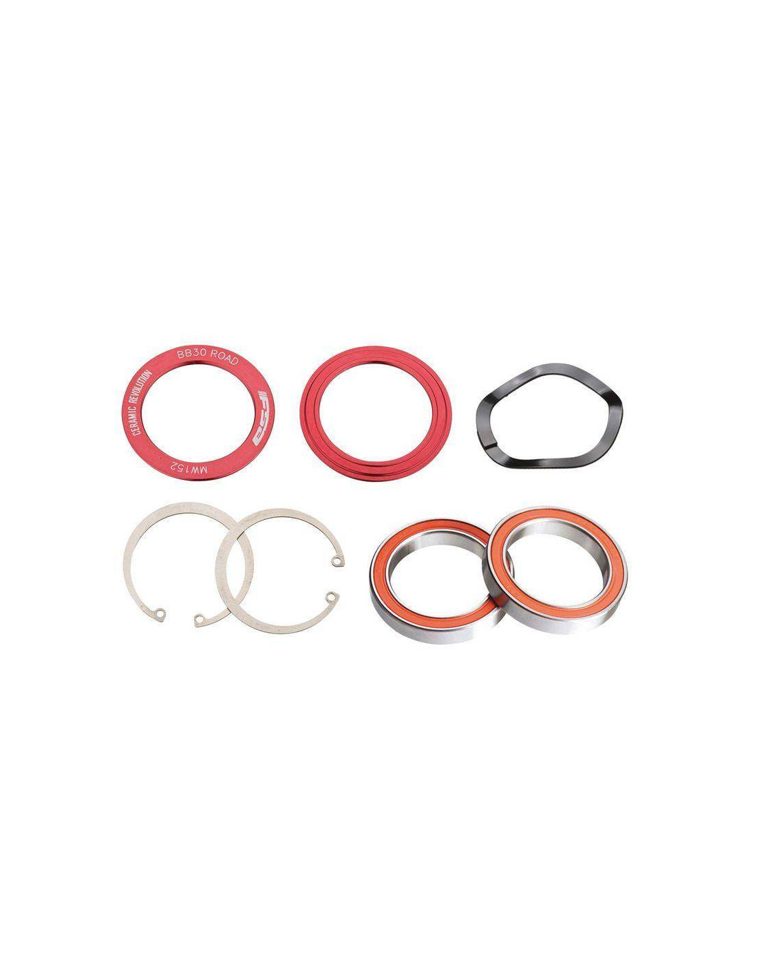 Ceramic FSA Bb 30 Road, ceramic bearings for roadbikes. BB30 ceramic FSA kit. Bearings include Nylon adjustment washers, an elastic washer (to compensate for shaft clearances) and two retaining washers.