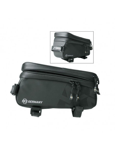 Explorer Smart top SKS borsa. I materiali durevoli realizzati in tessuto di gomma idrorepellente rendono la borsa da sella EXPLORER SMART un must-have per tutti i mountain biker. Una caratteristica particolarmente pratica è la custodia superiore del telefono cellulare con pass per cavi per cuffie integrati. Lo smartphone può essere facilmente utilizzato tramite il coperchio protettivo trasparente intelligente touch. La tasca extra sottostante è perfetta per un power bank piatto in modo che il tuo smartphone possa essere ricaricato mentre sei in sella a una bicicletta. La custodia del telefono cellulare può essere facilmente rimossa dall'unità in quanto è fissata con un gancio e un anello. La borsa è attaccata al tubo superiore da robuste cinghie di fissaggio in velcro. Le caratteristiche includono anche cerniere ermetica laminate con tecnologia ERGONOMICA EASYZIP e fodera interna arancione che rende gli elementi di contenuto facili da trovare.