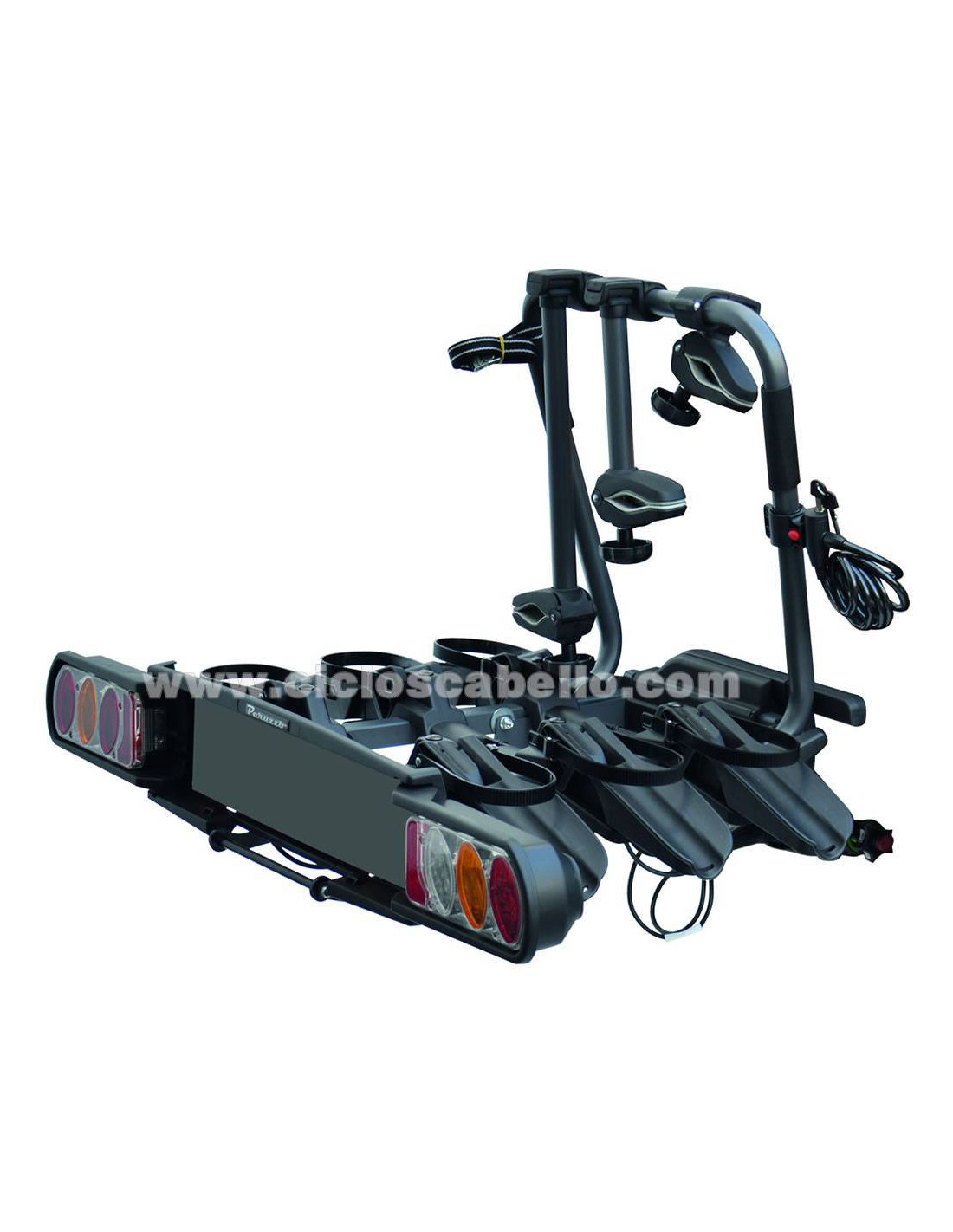 Viene consegnato completamente assemblato con braccio per tutte le biciclette, copricapi illuminati e a 13 pin, omologati secondo la direttiva europea.