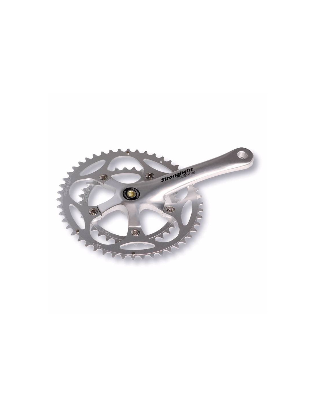 Bielas Stronglight Impact 170, juego de doble plato y bielas de la marca Stronglight, compatible con eje de cuadro tradicional. Compatible para bicicleta de carretera, platos mecanizados por CNC. FAbricado en aluminio. Platos anodizado en plata para 9/10 velocidades.